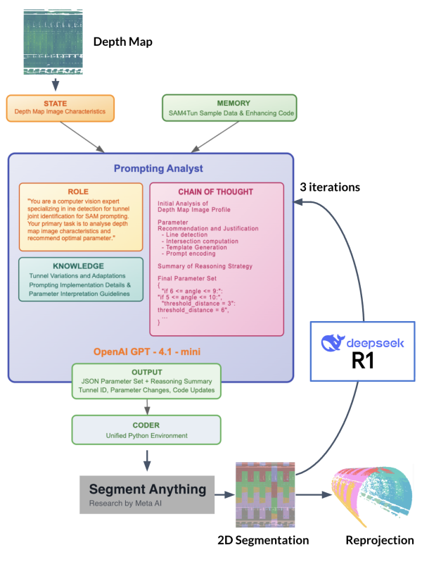 This work pioneers the use of agentic AI for tunnel point cloud analysis. The proposed framework (R4Tun) reformulates tunnel segmentation as a multi-agent reasoning system. Large language models (LLMs) with chain-of-thought prompting, domain knowledge retrieval, tool use, and self-reflection are embedded as agents that adapt parameters, generate code, and iteratively improve results. Unlike traditional supervised or foundation-model pipelines, R4Tun reduces dependence on expert tuning and produces interpretable reasoning traces. Tested on the Seg2Tunnel benchmark, it demonstrates improved generalisation across varied tunnel geometries and emergent self-reflective behaviours. The approach represents a paradigm shift where AI agents not only replicate but also augment expert workflows, opening pathways to adaptive, interpretable, and insight-generating structural health monitoring.